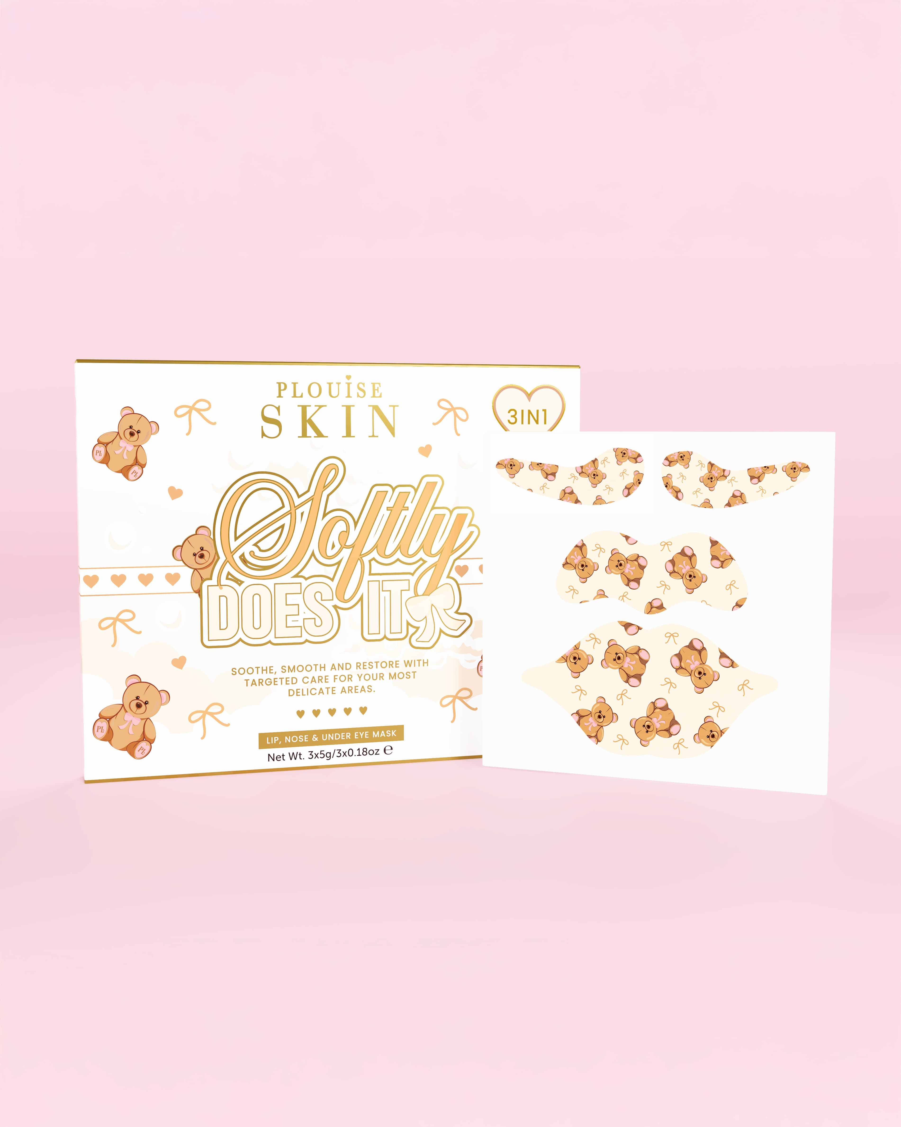 Give your skin a cosy, sweet treat with the Softly Does It 3-in-1 Lip, Eye & Nose Mask Set in our adorable teddy collection design.