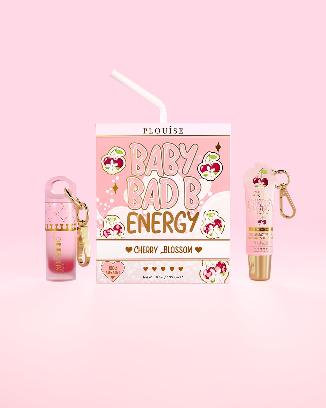 - Baby Bad Bitch Energy Lip Duo - Mini Stay Shining Lip Oil para um brilho suculento e Mini Lip Conditioner para manter os lábios macios e suaves, ambos finalizados com acessórios de chaveiro para retoques em movimento